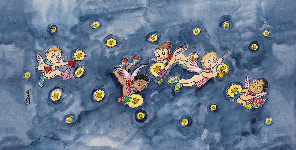Inspirada en la calma i espiritualitat de les nits d’hivern, aquesta bola de Nadal de 8 cm de diàmetre, presenta un cel estrellat ple d’angelets en una il·lustració exclusiva de Pilarín Bayés.